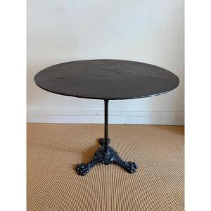 Table de bistrot ou de jardin en métal reposant sur un pied en fonte pieds de lion.