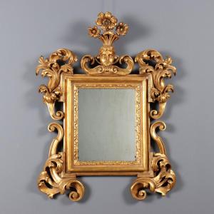 Petit miroir sculpté et doré. Cadre moulé et gravé, orné de sculptures baroques de feuilles, de volutes et de arabesques. Le cymatium présente un visage central, des feuilles et une composition florale. Miroir au mercure. Redoré. Italie, fin du XIXe siècle.
