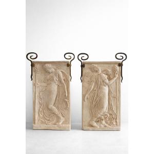 Paire de panneaux décoratifs en résine et poudre de marbre, début du XXe siècle. Italie. Ces panneaux représentent des figures féminines, suivantes du dieu Dionysos, plus connues sous le nom de Ménades, en pleine danse. Ils présentent un style typique des reliefs classiques. En partie supérieure, on distingue des supports en fer forgé aux extrémités recourbées ; ils servaient probablement d’éléments architecturaux décoratifs.