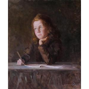 Alice BAILLY 1872-1938 Portrait d'enfant rêvassant, tableau, 1901 Suisse Albert Anker Vevey