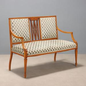 Canapé victorien en acajou, orné de garnitures en ébène, de bois violet et d'incrustations d'érable. Dossier tripartite avec panneaux latéraux rembourrés et panneau central ajouré, pieds pyramidaux tronqués et assise rembourrée. Angleterre, milieu du XIXe siècle.