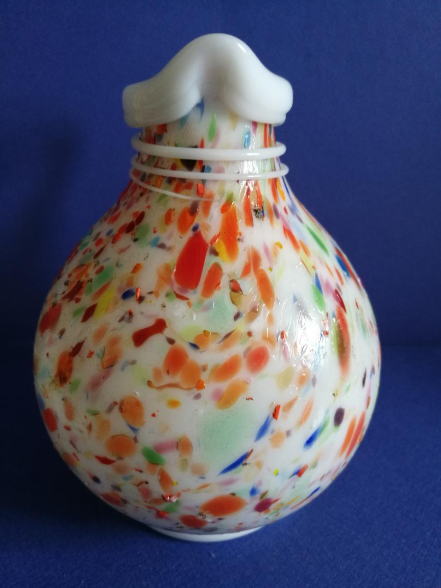 - Pichet à la panse sphérique avec filet rapporté autour du col. Verre opalin tacheté de gouttes de verre de couleur. trace de pontil sous le pied.