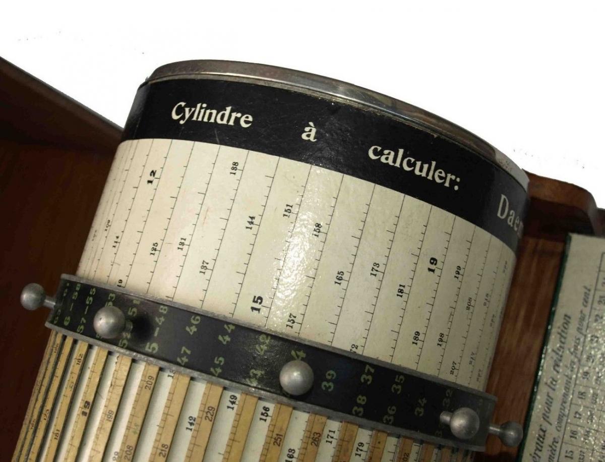 exceptionnelle machine à calculer suisse signé "daemen - schmid " à zurich vers 1900 - 1910 Cet appareil utilise le principe du calcul logarithmique. Il se compose essentiellement detrois parties : un cylindre d'une longueur de470 mm portant sur son pourtourde nombreuseséchelles logarithmiques doubles réparties régulièrement sur toute la circonférence ; un curseur pouvant être déplacé dans le sens de l'axe et de la circonférence du cylindre. plus une règle triface pouvant resortir en façade , l'instrument se couvre d'une coque de protection en bois