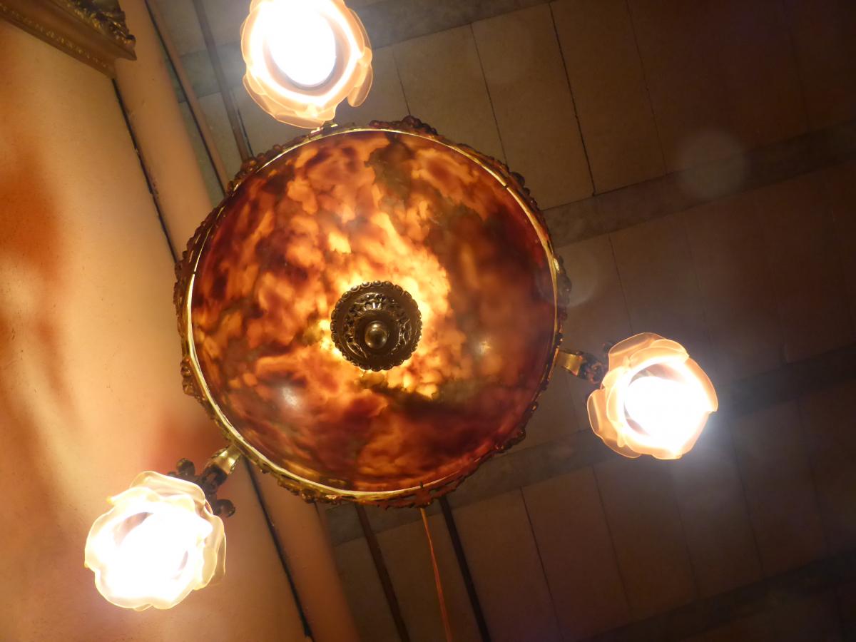 JOLI LUSTRE TULIPES EN VERRE COLORE ET BRONZE DORE