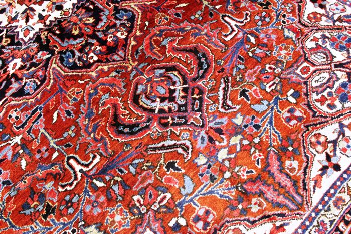 Voici un tapis Heriz : Ils sont fabriqués en une laine de haute qualité qui les rend résistants et très adaptés aux lieux publics et aux salles à manger, où l’usure est plus fréquente. Ces tapis orientaux sont noués à la main dans le nord-est de l’Iran et comportent souvent de grands médaillons centraux et géométriques. ** Le Heriz est considéré comme faisant partie des plus beaux des tapis simples de tout l’Iran.