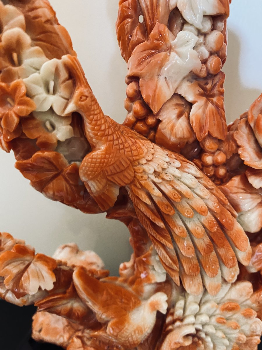 rare et important groupe en corail rouge parsemé de blanc représentant des oiseaux sur un cerisier travail de pekin vers 1930 poids 2520 grammes hauteur 36cm largeur 41cm