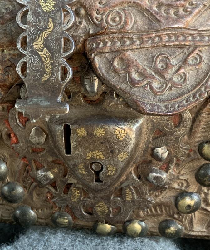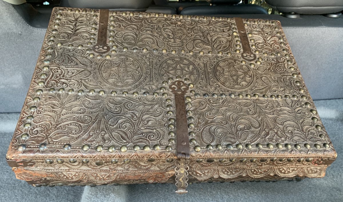 Très bon état de conservation, notamment de l'épais cuir avec un relief important floral traité dans l'esprit Renaissance. Il est cependant à noter qu'il manque l'extrémité du moraillon devant rentre dans la serrure du coffre.