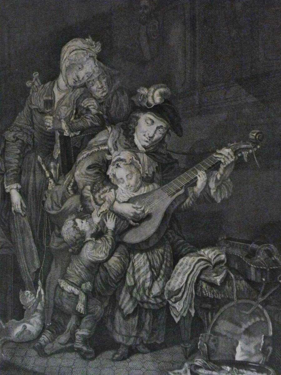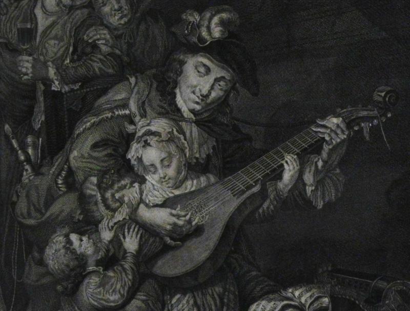 Gravure "le maître de guitarre", recoupée avec quelques restaurations, cadre en bois doré 18ème siècle (usures d'usage)