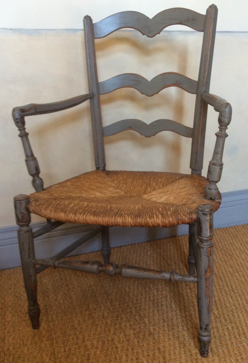 Confortable fauteuil paillé. Les accotoirs sont bien évasés et la peinture grise est usée. La paille est d’origine et reste en très bon état.