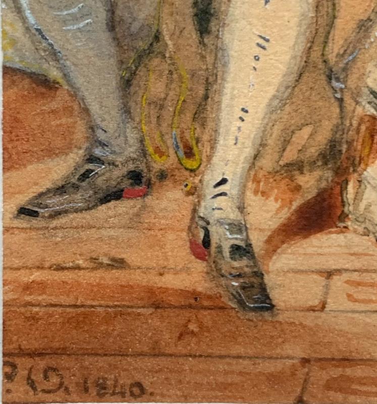 Aquarelle représentant une scène galante dans le goût du XVIII ème siècle. Monogramme indéchiffrable, datée 1840. Sous verre dans un cadre doré sculpté XIXème.