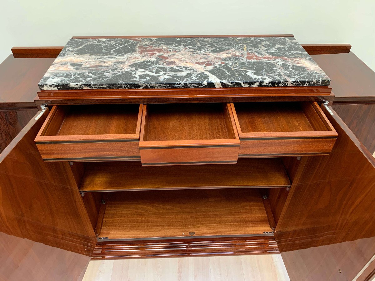 Très beau plateau en marbre rouge-gris d'origine. Intérieur en bois d'acajou avec finition satinée.