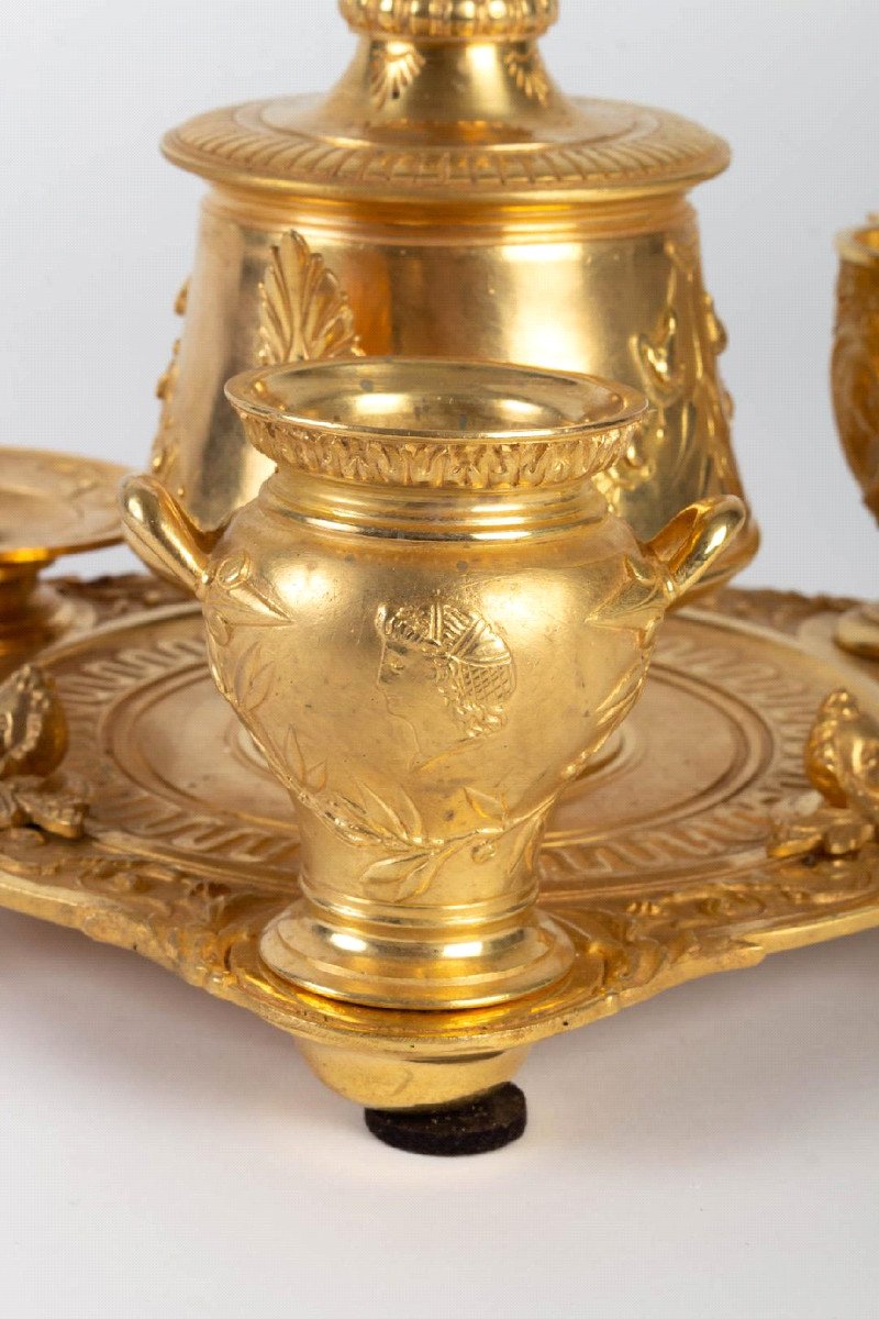 Composé de quatre pièces- pot à tabac couvert, timbale à cigarettes ou cigares, gobelet à allumettes et cendrier- soclées sur un plateau de forme trilobée, ce Nécessaire de Fumeur emprunte ses formes, sa discrète parure ornementale au monde de l'Antiquité gréco-romaine. Des camées à profils de Bacchus, de Cérés -divinités de l'Ivresse et de l'Abondance- et d'un noble patricien initié aux plaisirs dionysiaques renforcent Sa touche toute "Antique". Dotés d'ailes, d'exquis masques de satyreaux souffleur ajoutent une note de fantaisie à cet objet luxueux orné dans le Style PompéIen.