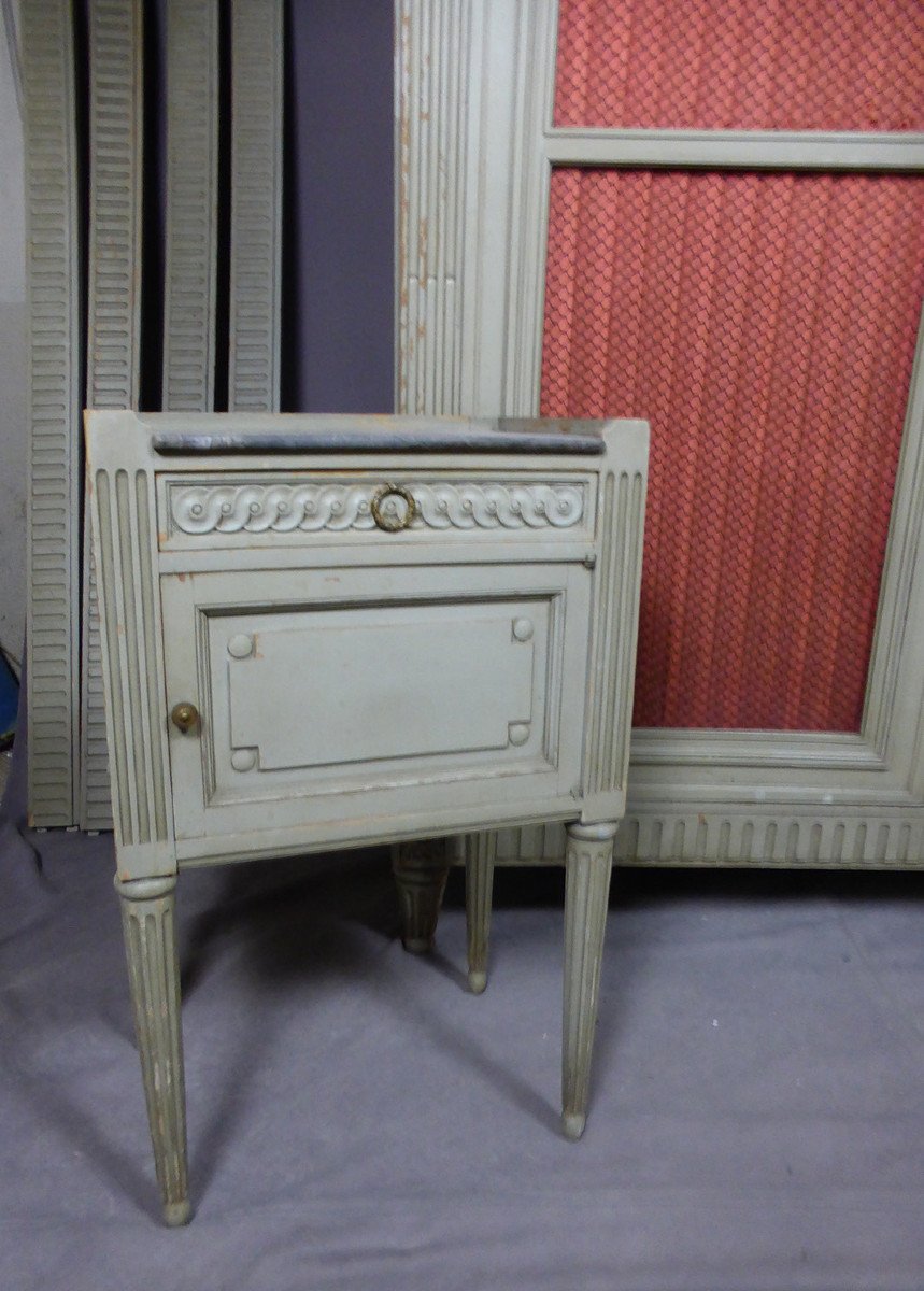 Mobilier de chambre à coucher en bois peint , style Louis XVI . Cette chambre comprend deux lits de 90 de large , une armoire et un chevet.