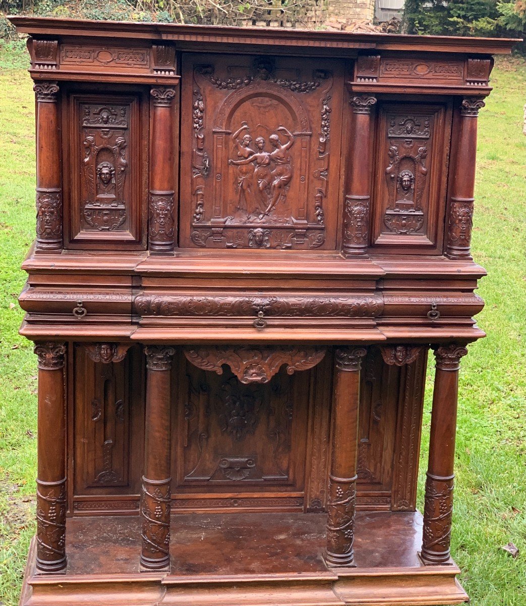 Si les conception et construction de ce meuble d'apparat font clairement référence au langage architectural de la Renaissance (façade à 3 travées, les 2 latérales plus étroites et en retrait -permettant de créer un jeu discret de perspective et de profondeur, scandée de 4 colonnettes à chapiteaux corinthiens) , cette influence est encore renforcée par le très riche décor de ce dressoir.