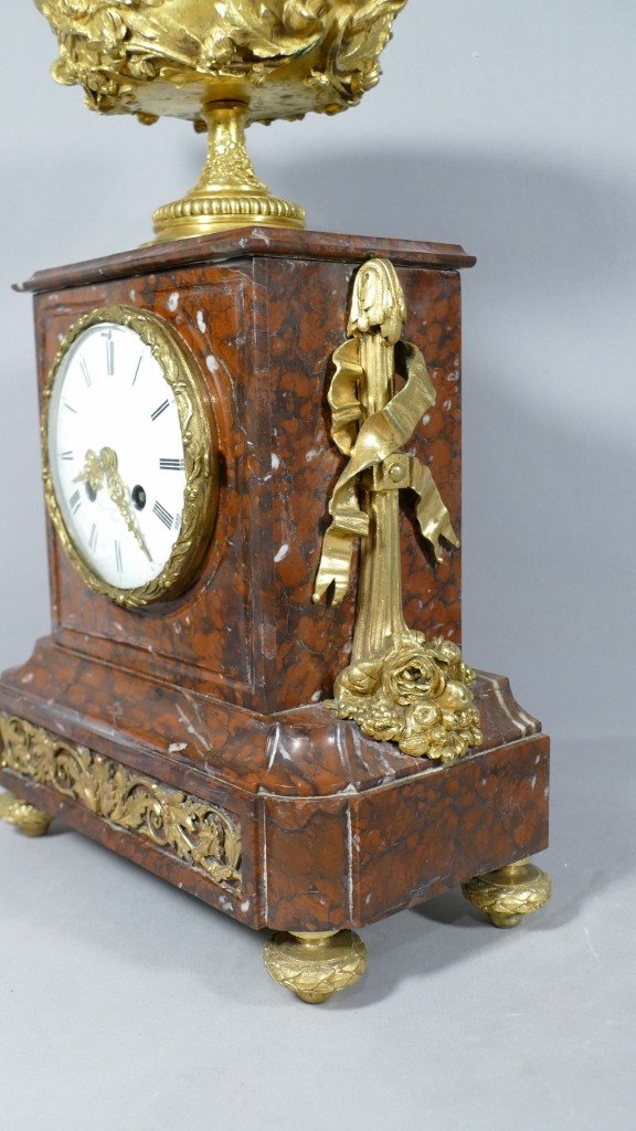 La pendule se compose d'une caisse en marbre rouge griotte avec application de frise aux feuilles d'acanthe en bronze doré sur le devant.