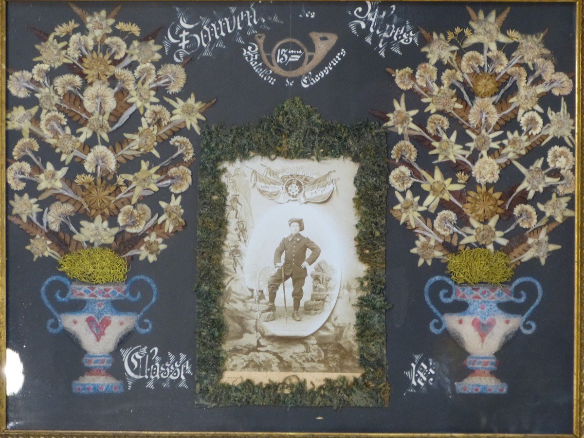 Composition réalisée autour de la photo d'un chasseur alpin, avec des Edelweiss et divers matériaux, tous naturels.