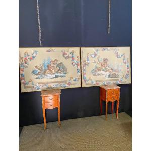 Petite boîte à pilule ronde émaillée, intérieur en métal doré, à décor d'un angelot tenant une colombe d'un côté et de l'autre de deux putti s'enlaçant, d'époque XIXème siècle.