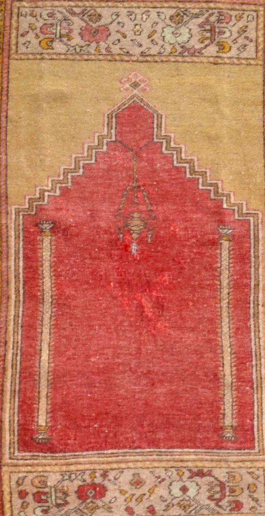 The design of this style of carpet remains strictly unique to the Avanos, the mihrab, decorated with its suspension, the characteristic red, the twin columns often present, and a tight but never stiff knot, which make them fluid and flexible carpets.