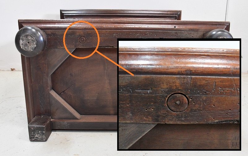 Small cabinet in solid Walnut, designed in the Gothic spirit, opening in front by a door with Generous Moldings forming frames. In the center, the panel is embellished with two Calligraphic and intertwined letters, perhaps an S mingling with an L. They are topped with a Crown, probably that of a Count. This door is equipped with a lock in working order accompanied by its key. Moreover, it has the particularity of being blocked at the bottom by a latch, which is activated by pressing a button hidden under the Cabinet. The interior is the result of a nice work of Cabinetmaking. It offers six storage compartments formed by the presence of a vertical partition and four fixed shelves with moving edges. The uprights consist of four Twisted Columns, supporting a Capital. The latter features a frieze carved with a succession of circles around its perimeter. The wooden top of this piece of furniture has wide overhangs with multiple mouldings, just like the base on which it rests. The assembly rests on two ball feet at the front and two straight feet at the rear. The sides are also ornate, and are embellished with prominent Fleurs de Lys. We will place our trust in this Small Decorative Furniture with doubly secure opening, which we will also appreciate for its Lodging. ******** Period: 1900 Perfect condition after restoration in our workshop. Wax finish only. Delivery possible by Colissimo with appropriate protection. Dimensions: Maximum length: 60 cm Maximum width: 33 cm Height: 71 cm Ref: 210720