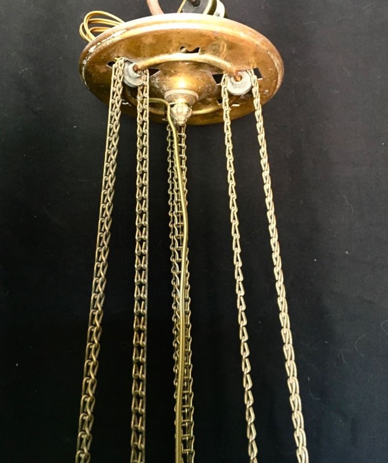 Pretty enamelled opalescent glass tealight holder decorated with flower, leaf and bird motifs. He is electrified. The chain up and down system is still in working order.