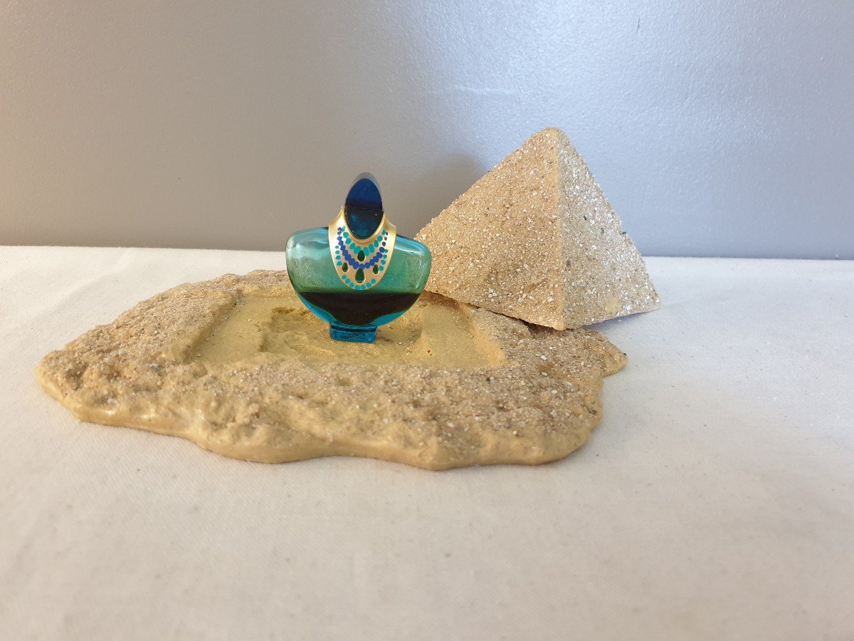 Mira Takla. "Valley of the Kings" perfume. Unique collection from the house of Serge Mansau, creator of all the bottles of this perfume. This set was acquired during one of the three auctions (that of April 10, 2022) organized after his death. It consists of nine bottles inspired by Egyptomania, three resin pyramids with their miniature bottles and the press kit. Three of the four 30ml bottles contain perfume. One of the four models has its box. The three small pyramids have their prototype, one has its box. Two prototypes contain perfume concentrate (1/3 of the bottle in one and 1/2 of the bottle in the other). The other bottles are empty and probably never contained perfume. The press kit, presentation, was designed with reference to the papyrus. The set is in very good condition. The press kit and the pyramids are exceptional pieces The containers were made by the greatest contemporary creator of perfume bottles. Serge Mansau has worked for all the major perfume brands. He has also made one-of-a-kind bottles. In other registers, he worked as a designer for Baccarat, Saint Louis, Daum, etc. He was also a sculptor. It was him that Mira Takla had chosen for her exceptional perfume. This one is unfortunately rare because of its short existence following the tragedy associated with it. After being put on sale in 1988 exclusively at Harrod's in London and at the Galeries Lafayette in Paris, Mira takla organized a grand launch in 1990 at the Heliopolis Sheraton hotel in Cairo. She had invited renowned people, particularly in the field of luxury, fashion and perfume. The festivities were to take place over several days. However, on the first evening, a fire broke out with the death toll at 19 and 70 injured. This was the setback for this perfume made from deciphered formulas of Egyptian hieroglyphs.