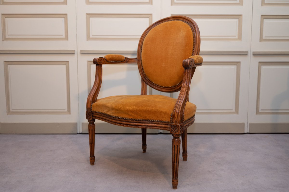 Pair of Louis XVI style cabriolet armchairs, molded medallion backrest, tapered and fluted legs, all fully pegged. Quality chair work from the beginning of the 20th century, correct gold velvet fabrics. Seat height: 0.40 m 480 euros per pair. For further information, please contact us. Delivery or shipment on estimate.