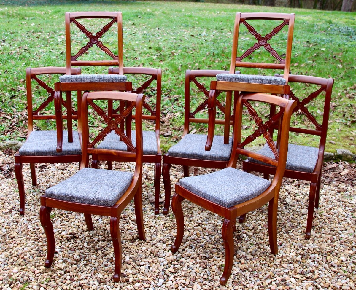 Superb suite of 8 chairs with 19th century frames in mahogany. They rest on console legs on the front and saber legs on the back. The reversed backrest is made up of a finely carved cross assembly with a floral motif in the center. All the chairs have been reviewed by the cabinetmaker and the seats completely redone. Its chairs are of great elegance, in perfect condition and solid, the seat with frame allows at any time and easily to change the fabrics.