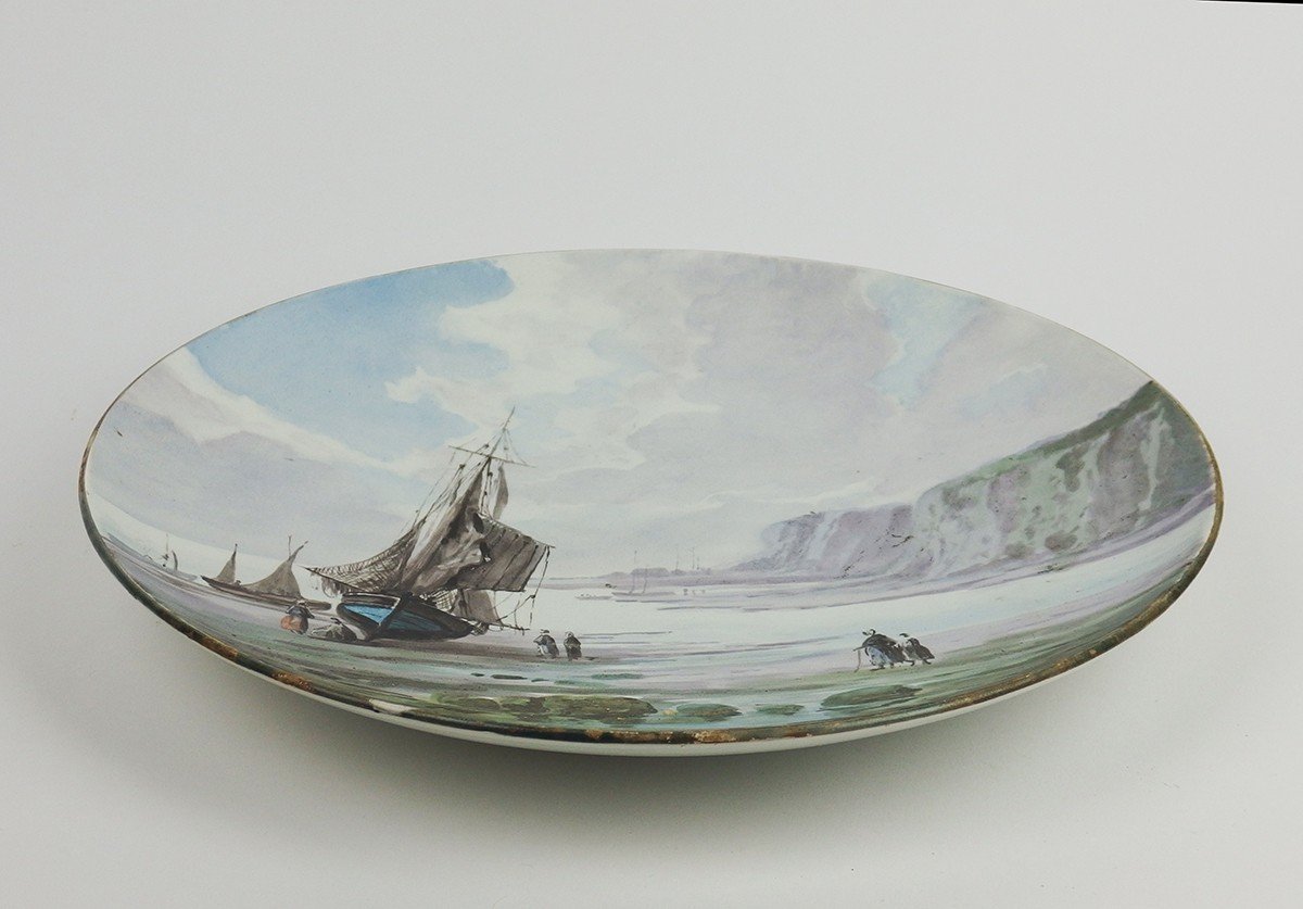 Fine earthenware dish by Barluet & Cie with a polychrome seascape of albaster coast:cliffs,ships & characters in low tide.France,between1879 & 1884,signed Montereau B C N°32.