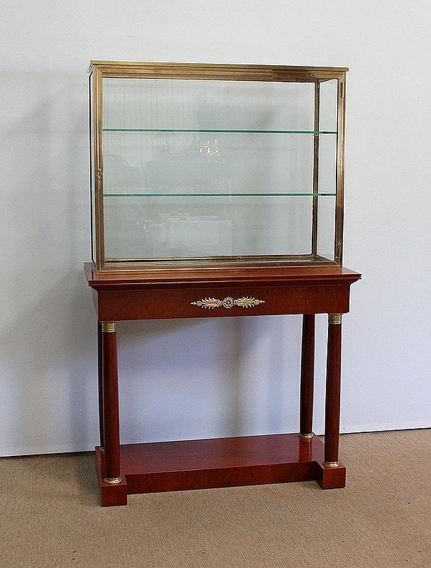 This couple forming showcase and vintage console, includes two distinct elements: an upper part consisting of a showcase visible from all sides, with frames entirely in brass, mounted with original screws. It opens with a large glass door, mounted on two hinges, and lined inside with two glass shelves, 1 cm thick and adjustable on notches at 2 cm. This opening is provided with a lock in working order, as well as a pair of original keys. The second part features a solid mahogany console, Empire style. Its tray is molded on its edges then surrounded by a fine band. On the front, its belt is adorned with an important bronze decoration forming a rosette and palmettes. This nearly century-old presentation property is built on four column legs enriched on its upper and lower ends with finely chiseled bronze rings. The whole of this commercial piece of furniture rests on a base cut with a recess on the front. We will remember that with its perfectly fine back, this property can be presented as middle furniture in your home or business. This set will be appreciated for its beautiful mahogany, as well as for its graceful pillars. This high-quality display case on a console could be suitable for an exhibition lover, a professional or for a chic and contemporary interior. ******** Period: 1st part of the 20th century. Excellent condition after restoration in our workshop. Finish only varnished. Additional photos available by clicking on the following link: https://www.antiquites-lecomte.com/boutique/meubles-de-commerce-et-de-metiers/ensemble-vitrine-sur-console-1ere-partie-xxe and installation possible, in France and in Europe, by our partner specialized in the transport of furniture. Dimensions: Showcase: Width: 102 cm Depth: 37 cm Console: At the top: Width: 107 cm Depth: 52 cm Maximum height: 173 cm Ref: 362 S