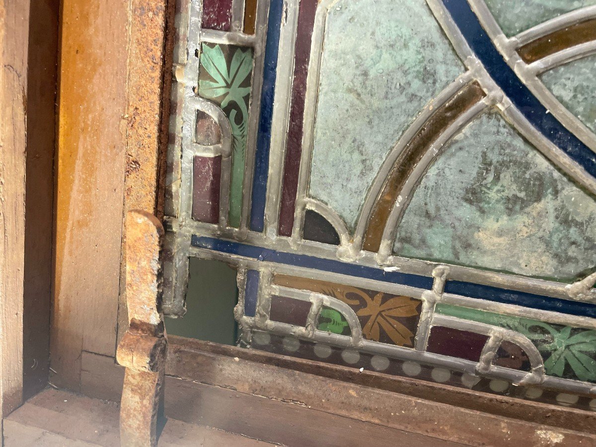 Shimmering colors and fine design are the characteristic features of this rich set. The two central panels are mounted on a frame allowing the opening. A master glassmaker will have to take up the various gaps and breakages in this harmonious structure.