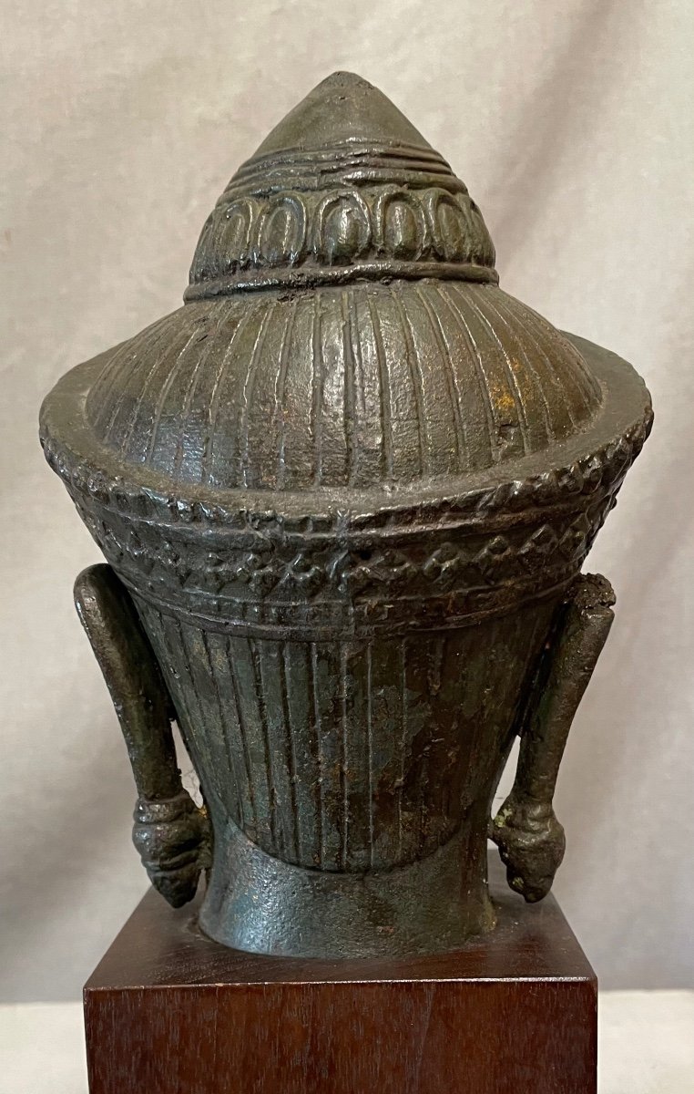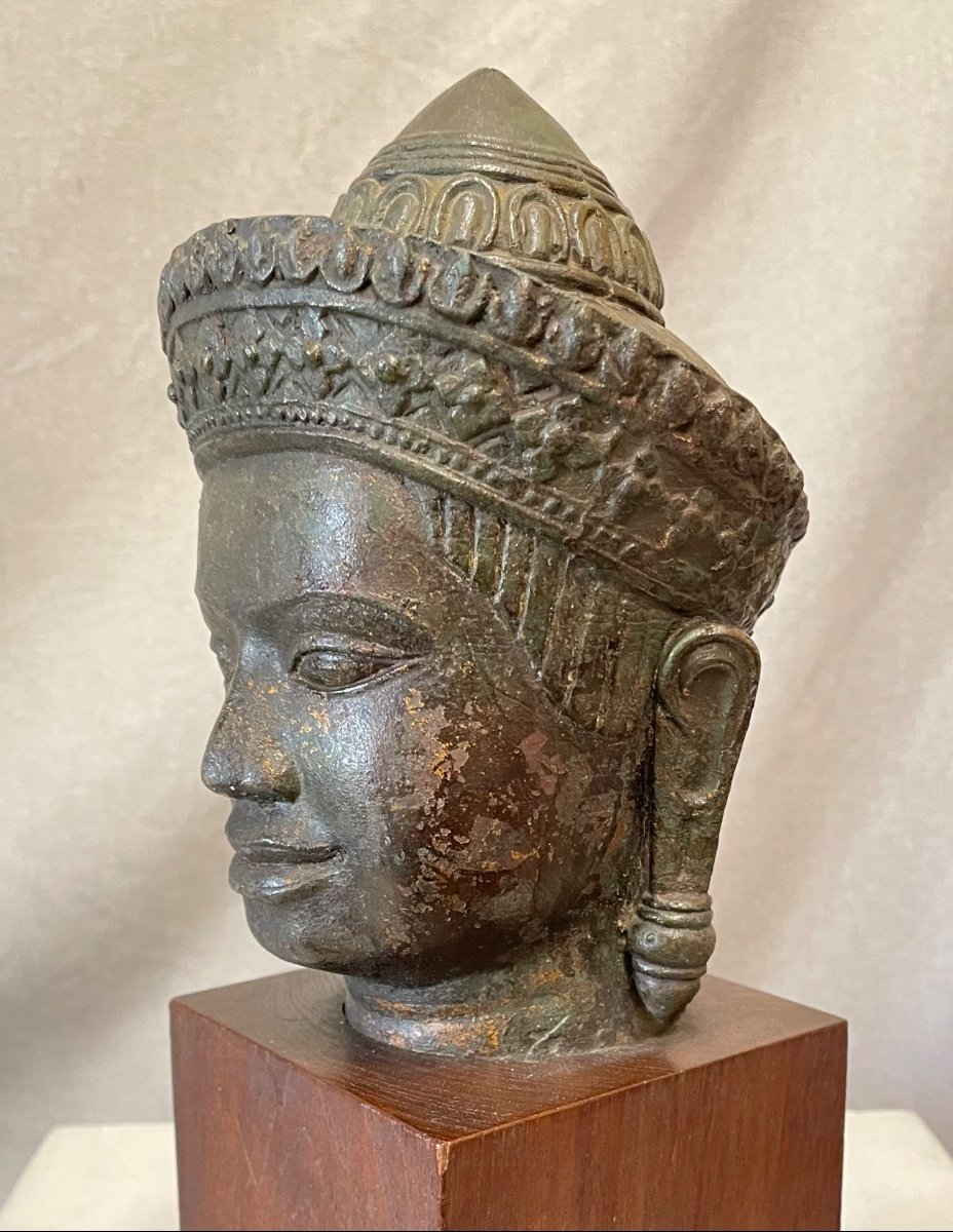 small bronze head of Shiva in the Banteay Srei style, beautiful chisel casting, there are small traces of cold gilding, mounted in a wooden base Private collection 19th century