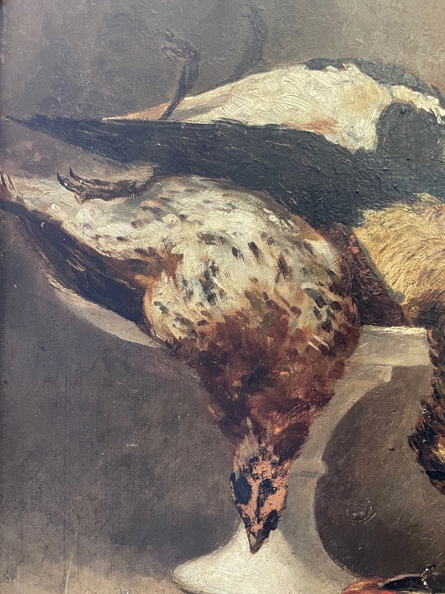 Return from hunting - Still life with birds. Lapwing, woodcock, gray partridge and larks are represented in this pretty painting signed L Leblanc and dated 1891. Oil on panel In good general condition, a few small scratches but nothing bad. Dimensions at sight: 53.5 x 34.5 cm Panel dimensions: 55 x 36 cm Total dimensions: 73.5 x 54.5 cm