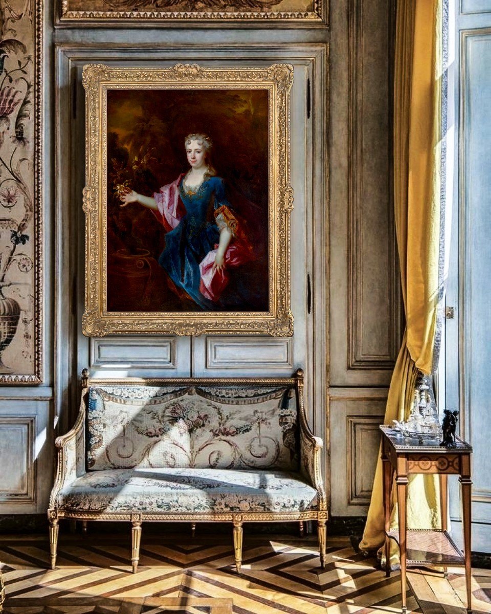 This portrait is that of Marie-Madeleine de Chamillart (died 28 May 1751) nee Nicolas de Lusse. She had a daughter, Anne, in 1692. In 1700 she married Clément Chamillart (1663-1708), President of the Accounts of the King's Chamber. The couple had a daughter, Madeleine (born 1701), who married Louis, the only son of Guillaume de Guitaut and Antoinette de Vertamont in 1719. Guillaume de Guitaut resided at Château d'Époisses in Burgundy France and his descendants still live today. A portrait of our sitter is still held at the Château.