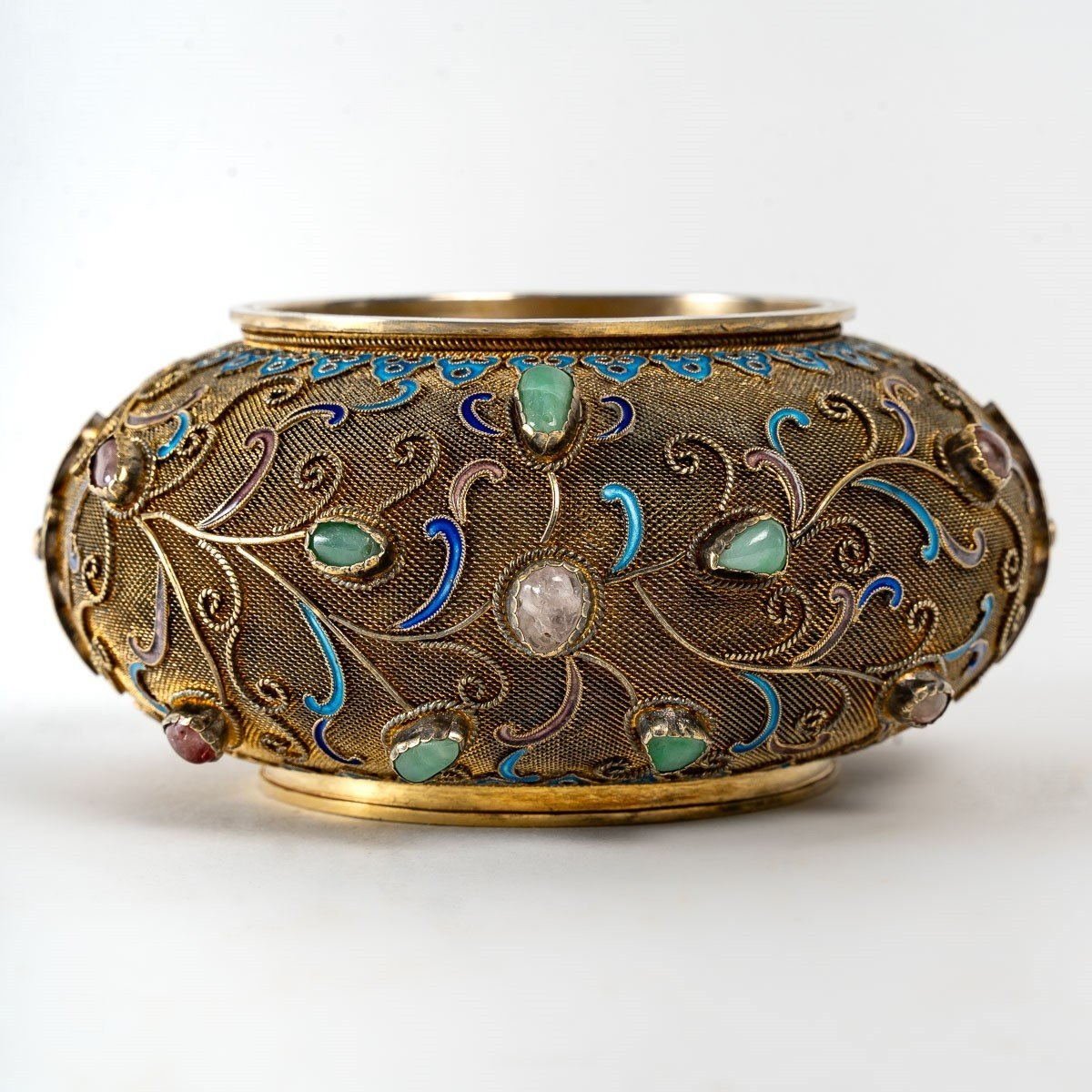 Lovely little vase-jewel, empty-pocket, in vermeil (gold-plated silver) filigree, semi-precious stones set and enamel. Prestigious Asian work, from the 20th century, which manages to combine multiple creative techniques and know-how such as filigree, the setting of cabochons and stones (Quartz, Jade, Coraline, etc.) as well as cloisonné enamels , all in a stylized and sophisticated green decor.