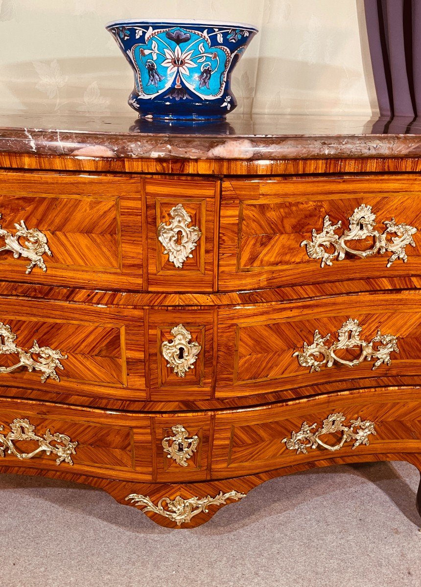 Commode Called "Tomb" Eighteenth Century Period. It is in Rosewood and Violet Wood Marquetry, in frames of stained Wood Nets. It is curved on the front with pinched uprights covered with magnificent openwork bronze scraps. The Feet are also covered with Openwork Bronzes. It opens on the front with 4 drawers in 3 rows, two of which are asymmetrical below the belt. It is topped with its original Royal Red Marble with a Bec de Corbin all around. She is in very good condition. It measures 130 cm in length, 64 cm in depth and 86 cm in height.