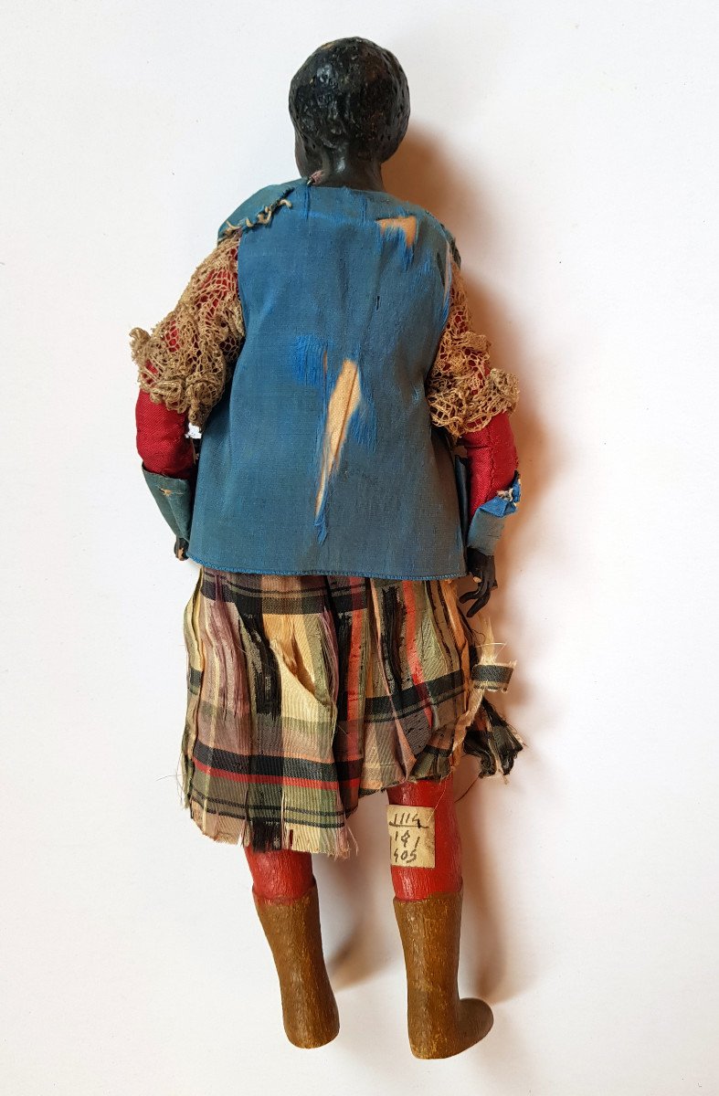 This is a charming figure of an African person from a Neapolitan nativity scene or crèche. The clothing is original and has suffered losses, but is still very beautiful. Also some little damages to the fingers, but a very beautiful figure.