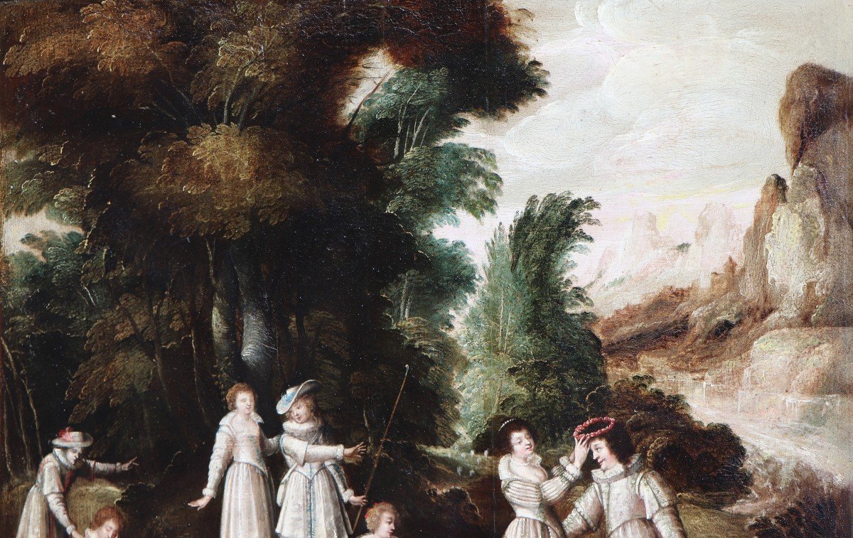 The subject of our painting is a courtly celebration of love. Our mysterious composition breaths an enchanting musical and theatrical mood and dreamy melancholy that one finds back in the early 16th century masterpieces of Giorgione and in the early 18th century “fêtes galantes” of Antoine Watteau.