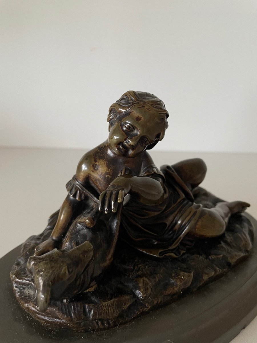 Bronze subject representing a child playing with his dog on a gray marble base, note small restoration on the marble. Dimensions of the bronze alone: Width: 16 cm Depth: 9 cm Height: 9.5 cm