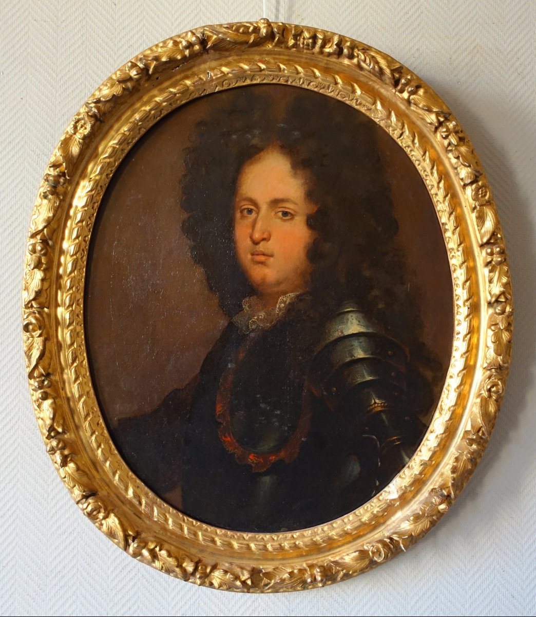 French School from the end of the 17th century or around 1700, portrait of an officer from the Louis XIV period. He wears a beautiful curly brown wig and rich armor in blackened and golden steel: he is a senior officer. Oil on oval canvas, it is presented in its original frame, in carved wood and gilded with gold leaf. Good general condition, on your original canvas, restored painting. Beautiful gilding Frame: 84cm x 74cm Canvas: 69.4cm x 57cm
