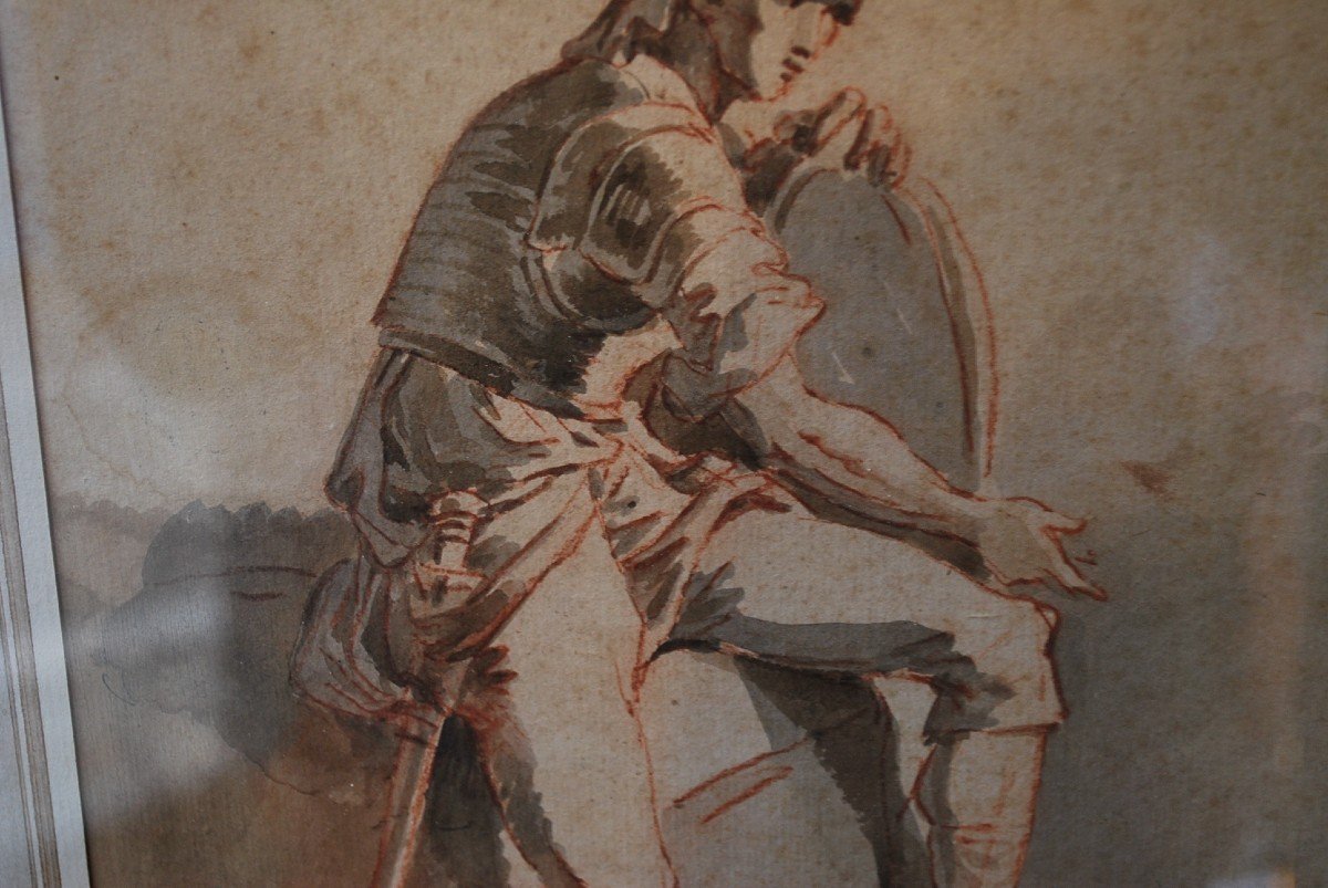 Drawing in pencil, watercolor and red chalk representing a seated man, holding a shield in his left hand, a sword at his belt on his left Italian work from the second part of the 18th century, Neo-classical Louis XVI style Nice drawing, well composed, some old old 20.5 by 28 on sight