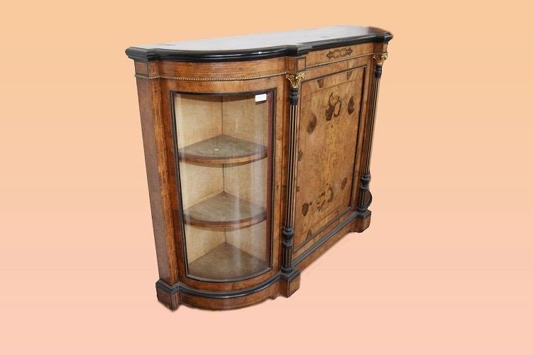 English sideboard from the first half of the 1800s, Louis XVI style, in walnut and walnut burl wood with an ebony frame and ebonized edges on the top. It features curved sides with glass doors and bronze applications on columns; rich inlays under the top and on the central door.