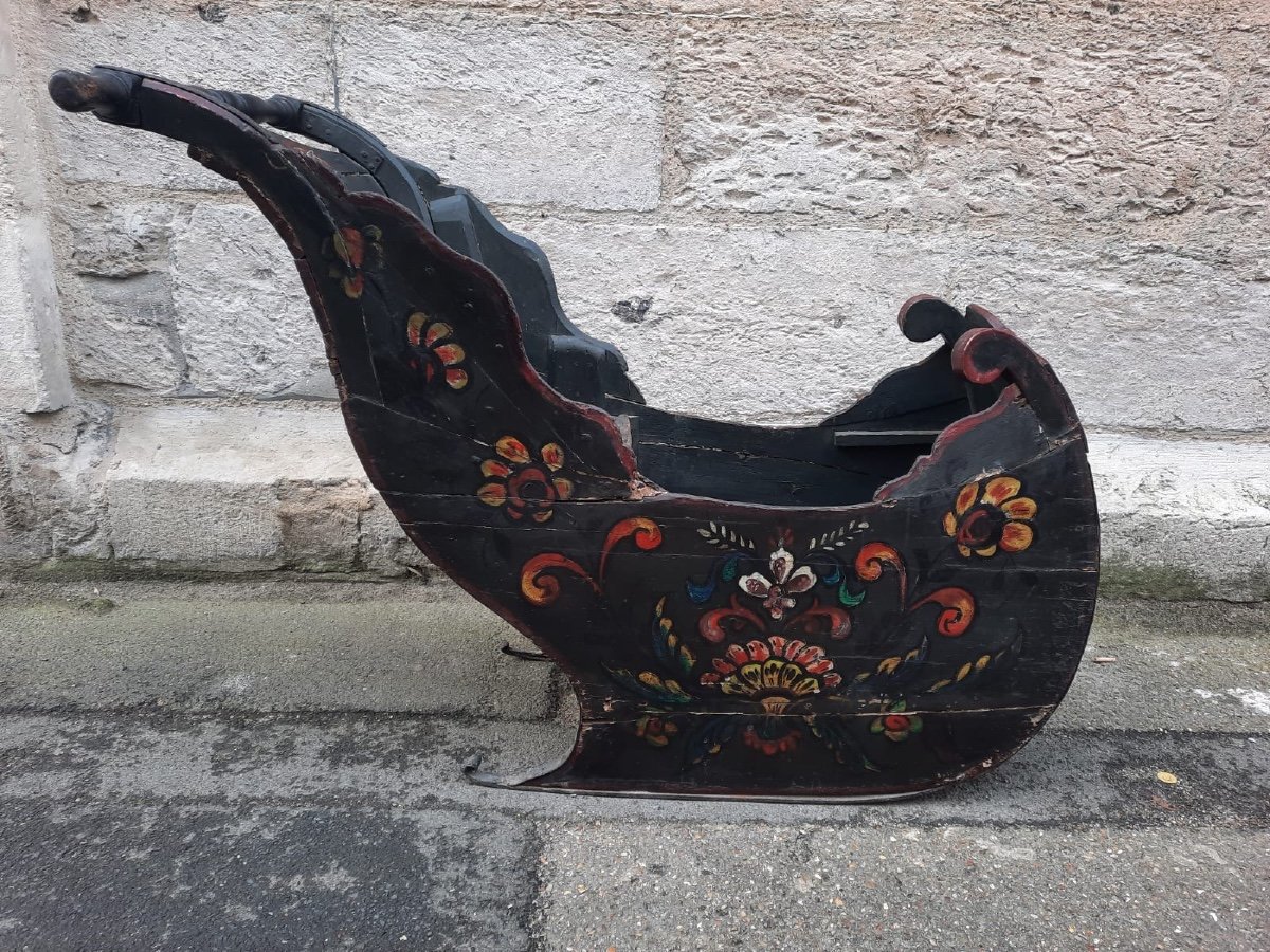 Traîneau en bois peint probablement d'Alsace. Le bois est de couleur vert foncé décoré de fleurs rouges et jaunes. Il possède 2 tiges de fer de chaque côté pour lui permettre de coulisser. Une barre en bois pour aider à le pousser. La tête est bien arrondie. Modèle monoplace pour enfants.