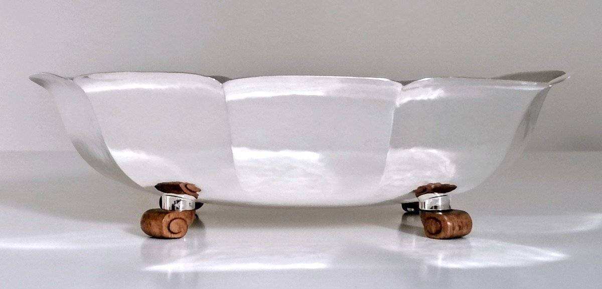 Bowl, centerpiece art deco in solid hammered silver with rosewood legs. Brussels around 1925. Silversmith Wolfers Frères. First title. 950/1000. Weight 1175 gr. Length 35 cm. Width 29 cm. Height 11 cm. There is a "reference work" in the catalog art deco silver of the museum Sterckshof in Antwerp.