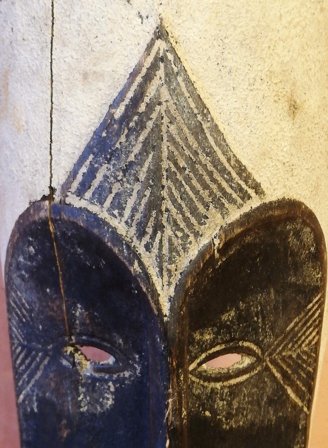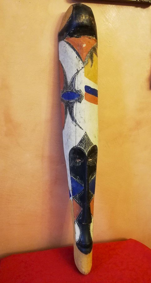 We present this polychrome ceremonial mask from Oceania in an elongated shape. All the polychromy is done with natural shades and the creation of this object is very artistic for my taste. Perfect geometry with contrast in colors, beautiful harmony. (E24)