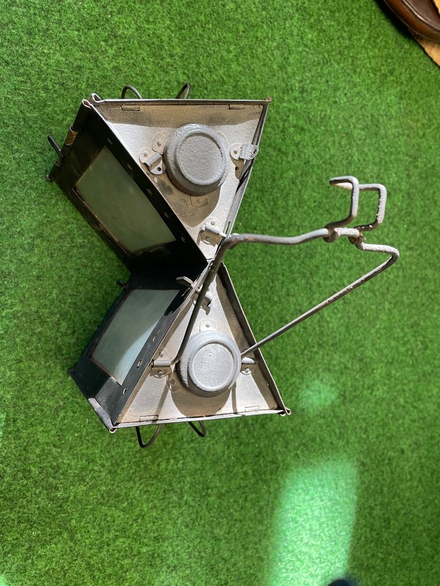 DOUBLE MONJARDET LANTERN OF THE 1910 MODEL, IS A FOLDING WHITE IRON LANTERN OF TRIANGULAR SECTION, PART OF THE SOLDIER'S PACKAGE THIS IS DOUBLE, IN VERY GOOD CONDITION OF CONSERVATION, ALL THE MICAS ARE PRESENT, COMPLETE PIECE.