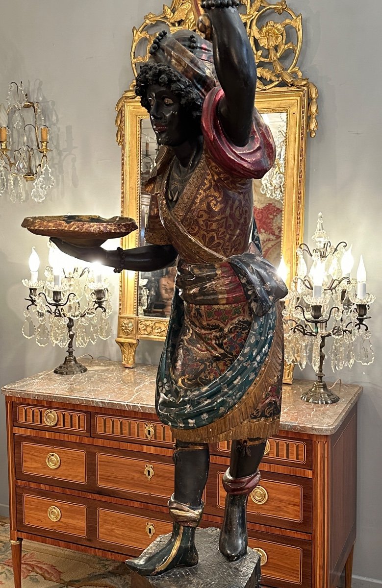 Important Nubian Torchiere Door In Carved Wood Venetian Work From The 19th Century Superb and Important Nubian Torchiere Door In Gilded, Carved, Polychrome Wood Resting on a Hexagonal Base Decorated with Lions' Heads and Garlands. This Nubian, Standing, is Draped in a Rich Venetian-style Garb, Decorated with Arabesques, Tied at the Waist and Wearing a Turban. This one carries in one hand, a glass torch and in the other, a dish. Very Beautiful Decorative Element, Very Beautiful Proportions. Venetian work from the 19th Century. Dimensions: Height: 218 cm Base Diameter: 49 cm In Good Condition. We are at your disposal for any additional information. WWW.DANTAN.STORE