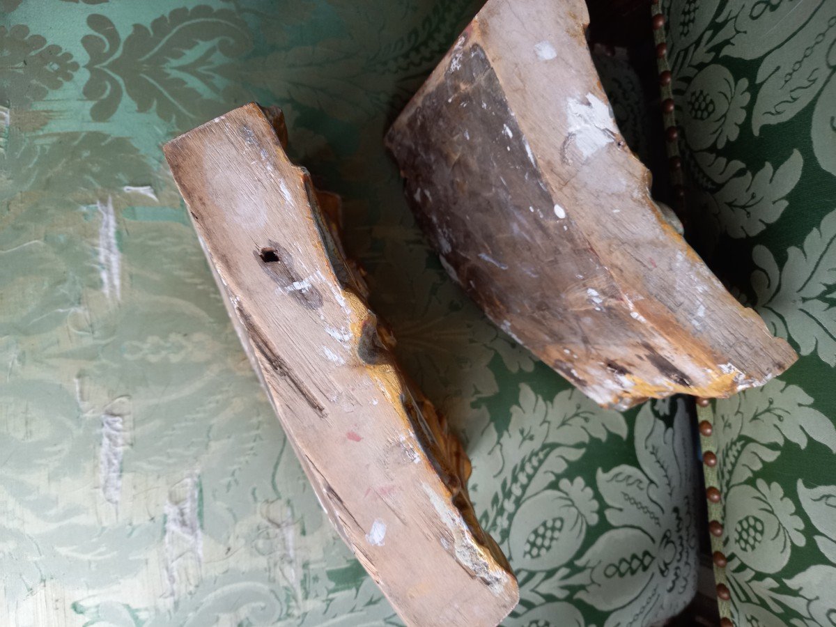 Pair of 18th century bas reliefs in gilded and polychrome carved wood, different sizes, but the same shape. The first represents the nativity, the second the Virgin and Sant Anne probably. The scenes are inscribed in a heart-shaped reserve. These are elements of religious architecture, from the Baroque period, and probably Spanish. The representation is all imbued with popular piety.