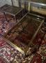 Set of four pieces in brushed and gold steel. Smoked glass. - Coffee table: length 97 cms. Width 52 cm. Height 37 cms - Trolley: length 86 cms width 46 cms. Height 59 cms. - a piece of sofa: length 39 cms. Width. 39cms. Height 58.5 cms - An end of sofa: length 51 cms. Width 39 cm. Height: 45 cm. Good used condition, small scratches. Delivery possible, please contact us.
