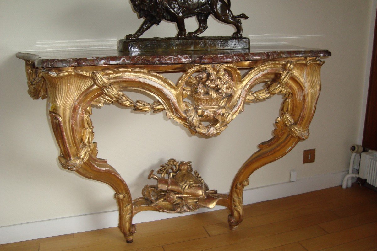 VERY BEAUTIFUL LOUIS XV PERIOD CONSOLE DECOR WITH GARDENER'S ACCESSORIES RESTORED MARBLE