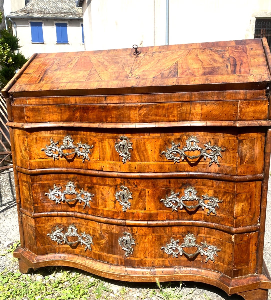 Rare Scriban Commode In Walnut Parqueted Wood, Movement From The Early 18th Century Northern Italy